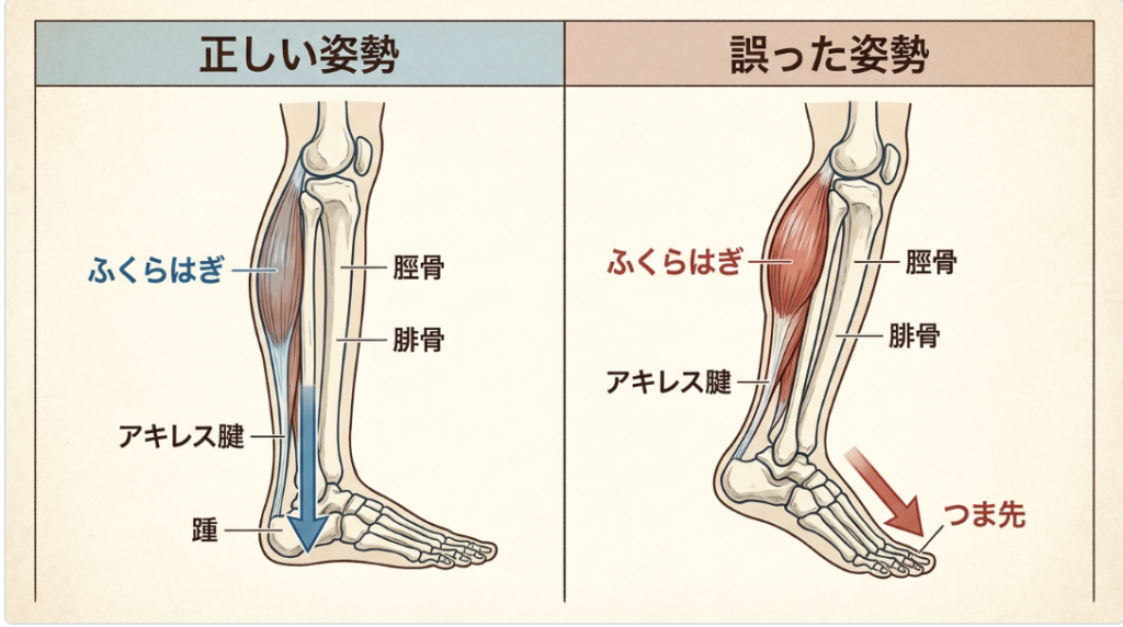 次に下半身です。「地面をしっかり踏め」と言われますが、これは「ふくらはぎに力を入れて踏ん張る」ことではありません。