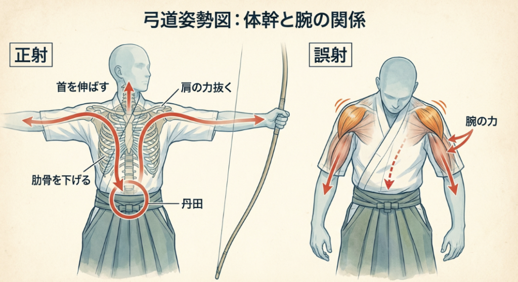 どんなに綺麗な手の内(角)を作っても、それを押し込む体(体幹)が弱ければ意味がありません。強い体幹が弱い手先を助ける。これが、腕力を使わずに強弓を開くための絶対的な真理なのです。