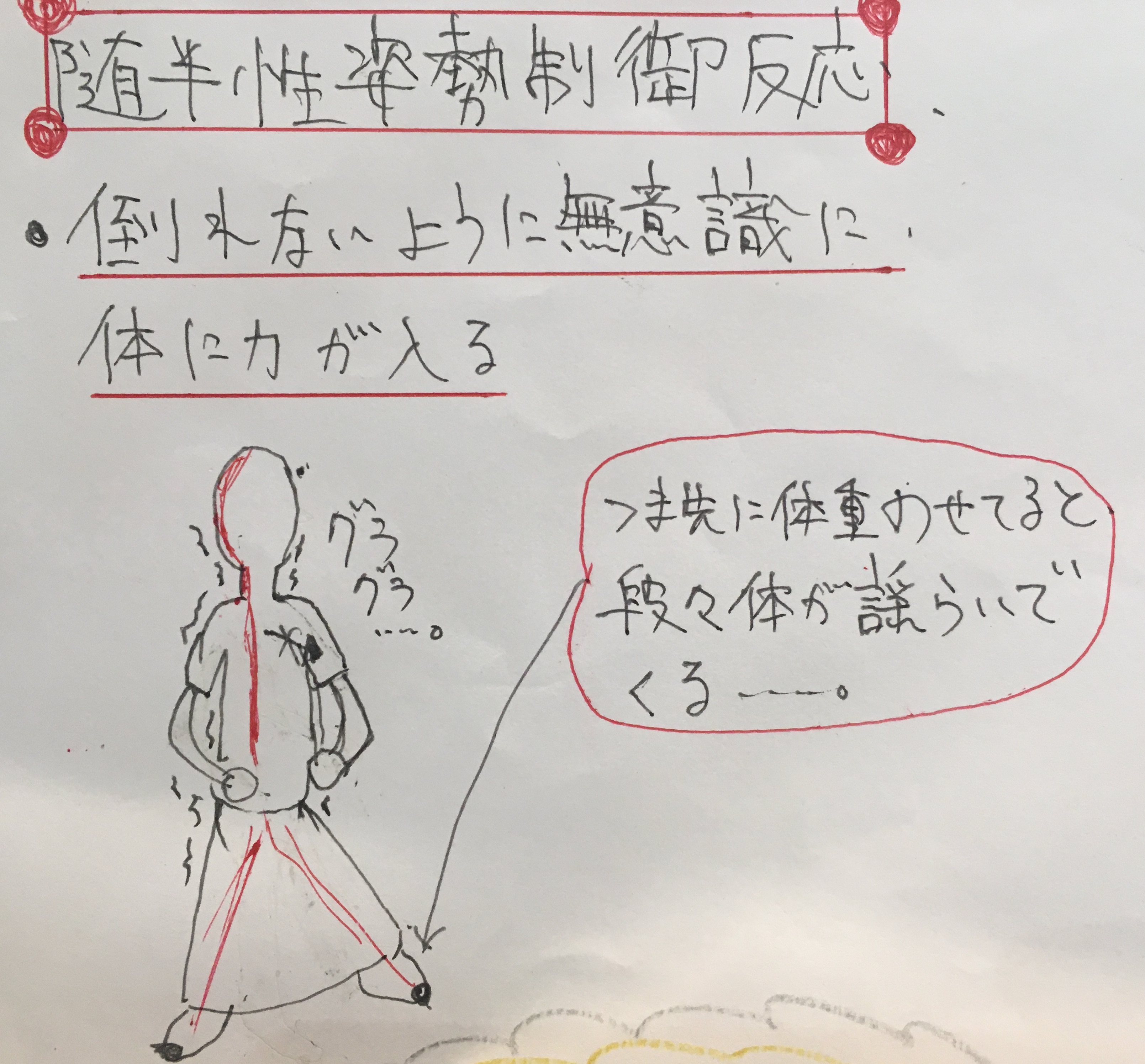拇指球荷重の姿勢にすると、無意識に体がぶれてしまうのです。これを、専門用語で随伴性姿勢制御反応(ずいはんせいしせいせいぎょはんのう)と呼びます。
