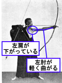 この内容は、弓道教本三巻の高塚範士や射學正宗でも記載されている内容です。強い押手は「左拳が上で、左肩が下になって、少しだけ左肘が曲がった」状態です。