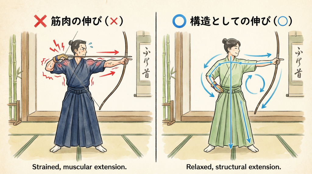 筋肉単体の伸びでは縮む力が働き、射が小さくなるため。構造で伸ばすことで、無駄な力が抜け、強弓も楽に引けるようになる。